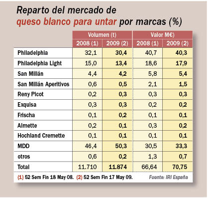 El mercado de queso blanco parece vivir ajeno a la situación de crisis económica y mantiene sus datos estables. A pesar de encontrarnos ante un sector ya en una fase de madurez, no se encuentran en sus cifras síntomas de decrecimientos. Así, según los datos que proporciona IRI, en 2009 se comercializaron 11.874 t, que supusieron un aumento de un 1,4% respecto al año previo. Mientras, en valor, la cifra alcanzó los 70,75%, aumentando un 6%. Además, como muestra de esta estabilidad no se perciben grandes cambios dentro de las cuotas de mercado, aparte del incremento que continúa viviendo la marca de distribución. En cualquier caso sigue liderando Kraft Foods con ‘Philadelphia’ y ‘Philadelphia Light’, que aglutinan entre las dos un 43,8% en volumen y un 58,2% en valor. Además, esta compañía presentó el pasado mes de mayo un nuevo formato para su queso blanco untable, que destaca principalmente por su nuevo sistema de cierre, que ayuda a que el producto se mantenga fresco durante más tiempo.