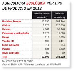En cuanto a la producción estimada para 2012, que recoge las últimas estadísticas publicadas por el Ministerio de Agricultura, asciende a 381.900 t. Este volumen básicamente encuentra su salida en los mercados exteriores, siendo Alemania y Reino Unido los principales clientes. Según un estudio de mercado, elaborado por la Oficina Económica y Comercial de España en Düseldorf, determina que en Alemania se puede hablar del boom de los productos biológicos, país donde las frutas y hortalizas suponen el 26,7% de la facturación de productos agroalimentarios. Así el acusado crecimiento de la demanda de productos ecológicos ha motivado un incremento de la superficie de cultivo, pero, sobre todo un significativo aumento de las importaciones españolas.