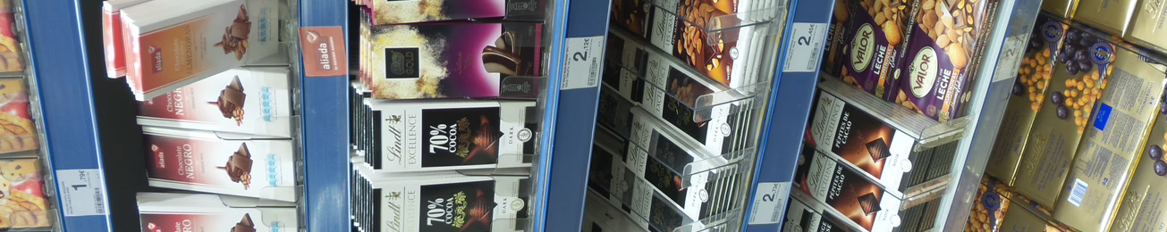 Se analizan todas las categorías de chocolates (tabletas, bombones, cacao soluble/instantáneo, etc.) y se recogen rankings de fabricantes, cuotas marquistas, etc.