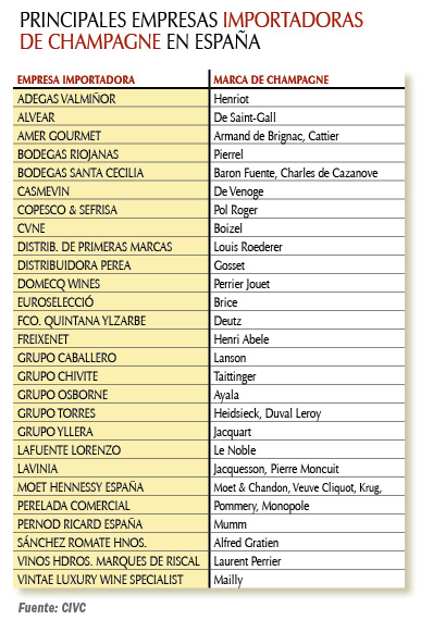 El grupo Osborne en concreto ha firmado este 2010 un acuerdo de distribución en exclusiva de la enseña ‘Ayala’ (perteneciente al grupo Bollinger), que incluye especialidades como un brut y un rosé con 0% de azúcar (única maison que presenta estas variedades, según comunicado de la propia casa). Por su parte, Bodegas Riojanas ha apostado por ‘Pierrel’, Adegas Valmiñor por ‘Henriot’ (que anteriormente era importada por Bodegas Escudero) y el grupo Caballero distribuye ‘Lanson’, que ha presentado este año la variedad ‘Lanson Extra Age’. Por su parte, Vinos Herederos del Marqués de Riscal lleva en su catálogo el champagne de Laurent Perrier, quien a su vez, comercializa los vinos de la bodega española en los mercados de Francia, Bélgica y Reino Unido.