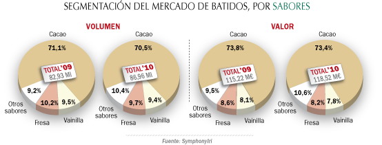 Desde el punto de vista comercial, los batidos continúan cosechando crecimientos en distribución, donde han conformado una oferta variada en formatos y variedades. Así, en el último año el avance ha sido del 5,64%, el más importante de los últimos cuatro ejercicios, en los que la categoría ha crecido un 12% hasta los actuales 123 Ml. Un avance en sintonía con el sector, con la consiguiente rebaja en su precio medio en un par de puntos.
