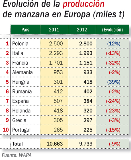 En 2012, España disminuirá un 24% su producción de manzana , ya que pasará de las 507.000 t en 2011 a las 384.000 t para este año . Estos son los datos aportados por la World Apple and Pear Association (WAPA) en la 36ª edición de Prognosfruit, celebrada el pasado mes de agosto. Esta profunda caída, que se recorta ligeramente hasta el 21% si se compara con los últimos tres años, supondría el desplazamiento de España al séptimo puesto en el ranking de productores europeos , cediendo dos posiciones a Rumanía y Hungría. Precisamente Hungría, se convertirá en el país que ofrezca el mayor crecimiento de su volumen (39%), pasando a contabilizar 418.000 t, seguido de Eslovaquia (18%) y Polonia (12%), principal productor europeo de manzana con un total de 2,80 M t.