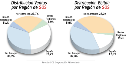 En lo relativo a ingresos, durante la primera midad del año el grupo logró un incremento del 5,5% hasta alcanzar los 714,05 M, mientras el Ebitda recurrente (sin incluir las citadas provisiones) fue de 54,31 M€. Por divisiones, aceites aportó una facturación de 524,63 M (+9,9%), arroz ingresó 154,3 M (-4,2%) y el área de diversificación obtuvo 35,11 M (-8%). Y en cuanto al reparto de la actividad por zonas geográficas, tras la integración de Bertolli a mediados del pasado año, el negocio internacional del grupo Sos representa ya el 68% de sus ventas y el 83% del Ebitda. En el mercado del aceite, Sos Corporación es el líder mundial con una cuota estimada del 22% y sus marcas están presentes en los cinco continentes.