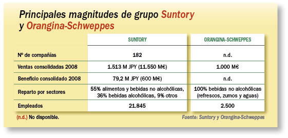 El gigante japonés de alimentación y bebidas Suntory ha presentado una oferta vinculante de compra a los fondos de capital riesgo Blackstone Internacional y Lion Capital, sobre la compañía europea de bebidas Orangina-Schweppes. La oferta de Suntory se situaría, según la prensa económica, por encima de los 2.000 M€, cifra ligeramente superior a los 1.850 M€ que ambos fondos pagaron en febrero de 2006 a su entonces propietario Cadbury Schweppes.