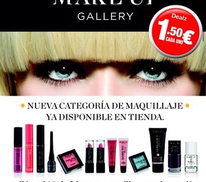 Dealz España filial del grupo británico Poundland, acaba de introducir una nueva línea de maquillaje integrada por casi 150 referencias, que comercializa a su tradicional precio unitario de 1,5 €. Bajo el paraguas de 'Make Up Gallery' se incluyen una línea para el maquillaje de ojos, con 36 productos; otra para los labios, que suma 39 referencias; una tercera para el rostro, con 24 productos, y una última de uñas, con 44 colores diferentes. Esta gama proviene de Gran Bretaña, desde donde la importa la filial española de Pounland. 'Make Up Gallery', que se lanzó en Reino Unido en otoño de 2014, se puede encontrar en las tiendas españolas desde el 18 de mayo. Esta gama se suma al reciente lanzamiento de otra de bricolaje doméstico, con las que la compañía amplía su surtido.