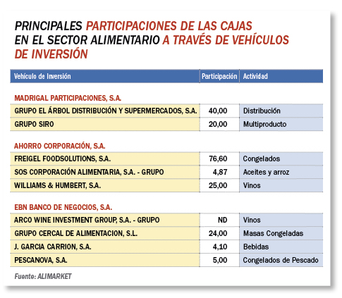 En su participación en el sector alimentario conviven también las dos almas de las cajas de ahorro. Por un lado, su vertiente comercial se traduce en la ya citada presencia como accionista en las principales compañías cotizadas, donde han tomado el relevo que jugaron las corporaciones industriales de los bancos hasta la década de los noventa del pasado siglo. En esta misma línea se encuentran también las operaciones de financiación que conllevan algún tipo de capitalización de parte de la deuda, y que permiten dar sostén económico a importantes proyectos. Es el caso de Caja Burgos, Caixanova y CCM en Luis Calvo; o de la CAM, Cajamurcia, Cajasol y CCM en García Carrión. Y es que aunque las fusiones se planteen ahora como una novedad, lo cierto es que las cajas ya colaboran entre sí para abordar proyectos de gran dimensión. Algunas cuentan incluso con vehículos de inversión compartidos, como Inversiones Madrigal para las cajas castellanoleonesas u otras sociedades como Atalaya Inversiones (Caja Badajoz, Caja Granada, CCM, Cajasol y Caja Murcia), Adamante Inversiones, Zoco Inversiones...