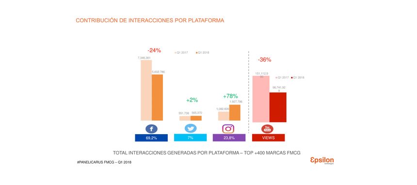Según se desprende del Panel Icarus de Gran Consumo Q1 2018, a pesar de liderar la generación de interacciones (69%), las marcas están disminuyendo la actividad en Facebook (-18%), lo que está afectando principalmente a las interacciones en esta red (-24%). Se percibe también una leve reducción de actividad en Instagram (-3%), red social que también pertenece a Facebook, pero con contenido de mayor calidad, lo que ha provocado un destacado aumento de las interacciones en esta plataforma (+78%). Esta reducción de interacciones en Facebook se explica por la disminución de la actividad en los territorios que mayor engagement generan en esta red: los sorteos (-14%) y las recetas (-8%). Por el contrario, en Instagram se constata un aumento de sorteos en un +40% y en recetas en un +21%, lo que explica el aumento de las interacciones en esta plataforma. Estos contenidos son los que mayor share en interacciones generan en marcas Top como 'Ybarra', 'Gallina Blanca', 'Florette' y 'Ducros'.