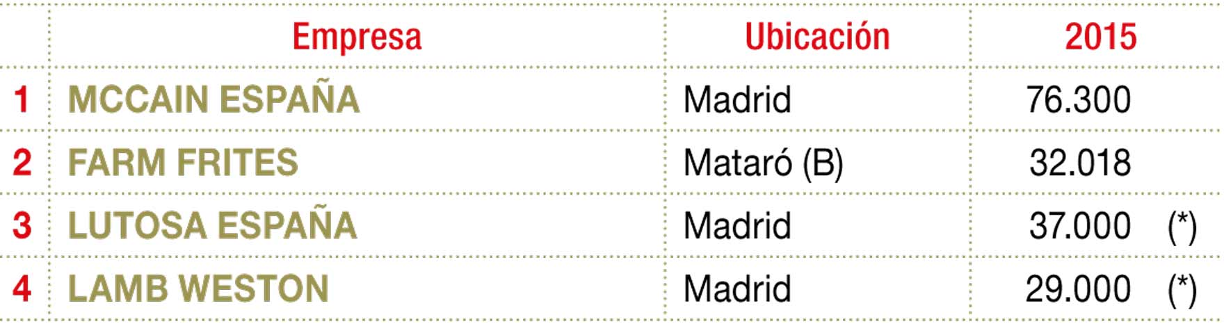 El canal foodservice continúa dando buenas noticias a losespecialistas en patata prefrita que operan en el ámbito nacional. El buen comportamiento del turismo, del gasto medio, y la consolidación en el incremento del gasto fuera del hogar del consumidor nacional están detrás de un ejercicio 2017 muy positivo para los operadores de patata prefrita con actividad en nuestro país. Al frente de esta tendencia positiva se sitúa el líder sectorial, Mccain, que presentó una progresión en sus ventas durante 2017 del 7,4%, para alcanzar los 80,8 M€. Esta tendencia positiva se ha visto apoyada además durante los últimos meses en la moderación del coste de la materia prima, que tras dos años con un precio medio alto, se ha visto beneficiado por las mejoras en el rendimiento de las cosechas en curso.