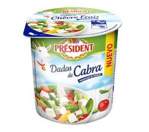 Los nuevos dados de cabra 'Président' son actualmente la primera y la única referencia de la categoría queso de cabra del mercado español con este formato. El producto se presenta en un vaso de 120 gr desde el que se pueden escurrir los dados y verter el queso directamente en el plato, ofreciendo practicidad al consumidor de ensaladas.