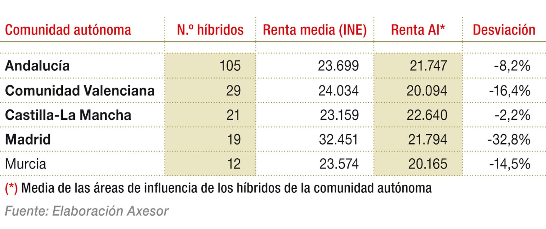 Andalucía, la comunidad con mayor número de híbridos, presenta una desviación en renta mucho más moderada que a nivel global: un 8% por debajo de la renta media de la comunidad y con una renta media algo superior a la media global, 21.747€. Este dato indica que los establecimientos estudiados se sitúan en zonas de renta algo por debajo de la media, en zonas que se podrían calificar de rentas medias y medias-bajas, pero sin llegar a ser zonas muy deprimidas económicamente. Esta tendencia se acentúa en la Comunidad Valenciana (16% por debajo) y en Murcia (14%), ambas comunidades con las rentas netas por familia más bajas en promedio, cercanas a los 20.000€. El resultado que más sorprende, por la gran diferencia existente entre la media de la comunidad y la de las zonas de los supermercados híbridos, es Madrid. En este caso, los centros se ubican en zonas de rentas muy bajas, por debajo de los 22.000€, casi 11.000€ menos que la media de la comunidad, lo que representa un gap de más del 32%. Este resultado se explica por los municipios en los que se ubican estas tiendas. En concreto, en poblaciones de rentas medias y bajas como Leganés, Fuenlabrada o Parla, aunque sin olvidar que hasta cinco de ellos se concentran en la capital.