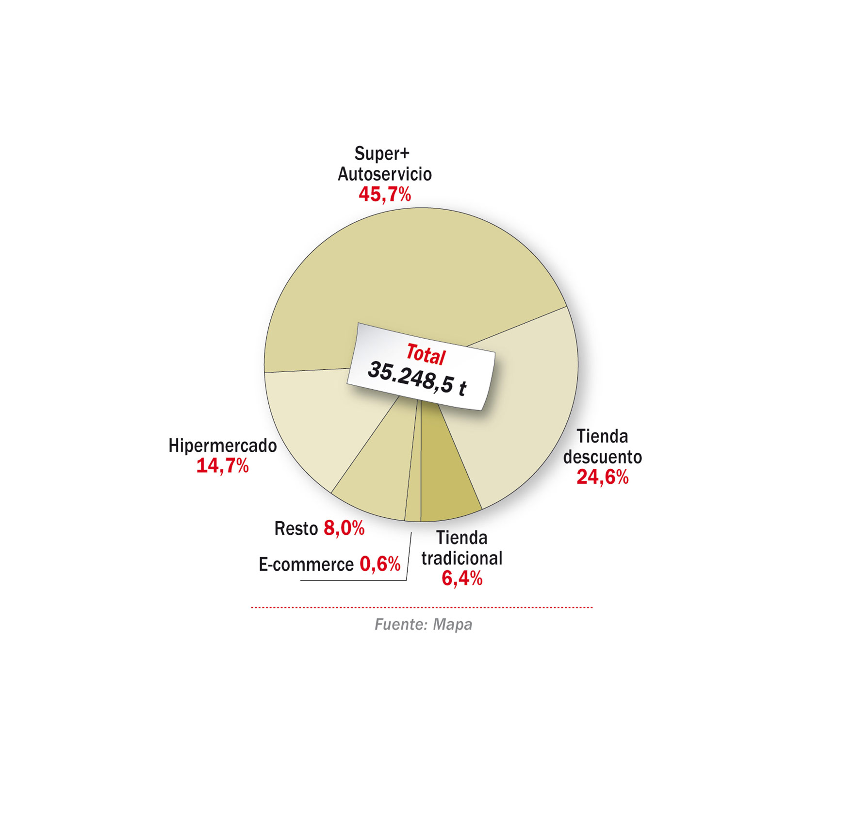 Atendiendo al tipo de establecimiento donde se adquieren, el supermercado y el autoservicio tienen una cuota en volumen del 45,7%, con una variación con respecto al año anterior negativa en un 3,7%. En 2018, casi una cuarta parte del volumen de estos productos se adquirió en tiendas descuentos, tras crecer un 6%. Finalmente, canales como las tiendas tradicionales o el resto de superficies que no se corresponden con el canal dinámico pierden volumen con respecto al año anterior, mientras que el ecommerce, pese al esfuerzo por potenciarlo de muchos fabricantes, apenas alcanzó el 0,6%.