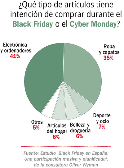 España es el país europeo que más va a participar en esta jornada de descuentos, como indica el estudio 'Black Friday en España: Una participación masiva y planificada', realizado por la consultora Oliver Wyman, que detalla que el 84% de los encuestados planea aprovechar para comprar este día o el lunes siguiente (cuando se celebra el Cyber Monday, exclusivamente en el canal online), un 20% más que la media europea. Por canales, también supera al resto de países tanto en compra en pure players (65%, frente al promedio del 47%), en webs de las distribuidoras (44% en España y 30% en toda Europa) o en tiendas físicas (41%, 12 puntos más que la media). Además, a pesar de tener una renta per cápita inferior, el gasto será similar al del resto de países y se situará en 258 €, coincidiendo con el presupuesto de los participantes alemanes y solo 14 € menos que el promedio general. No obstante, el gasto variará en función de la edad y el género, por ejemplo, casi uno de cada tres hombres (32%) dedicará más de 300 €, frente a solo un 18% de las mujeres, mientras que más de la mitad de los treintañeros (53%) gastarán más de 200 € y los mayores de 60 años optarán en un 60% por un desembolso por debajo de esa misma cantidad. Los españoles son también de los que más planifican sus compras, ya que un 62% emplean estos dos eventos para adquirir productos que llevaban tiempo queriendo comprar (solo le supera Rusia), otro 20% adelantarán compras de cara a la Navidad y el 18% realizará compras espontáneas. De la misma forma, la mitad de los encuestados afirma que pospondrá la compra de aquellos productos cuyo precio considere que no está suficientemente rebajado, otro 25% se decantará por artículos más baratos de similares características, un 11% desistirá en la adquisición y, en cambio, otro 14% acabará comprándolos a ese precio. Por tipos de productos, las mujeres elegirán la moda de forma mayoritaria (47%) y los hombres la tecnología (56%).