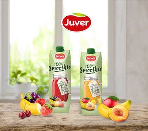 Juver Alimentación relanza su línea de smoothies bajo la referencia '100% Smoothie', en un formato familiar de 1 l y dos sabores: melocotón-mango-plátano y fresa-plátano-uva tinta-cereza. Se trata de un producto elaborado "únicamente a base de fruta batida", con una textura más densa que la de un zumo tradicional y que, dado que se trata de un puré de frutas 100%, "es una alternativa saludable para poder alcanzar la recomendación diaria recomendada de consumo de fruta y verdura", estimada en cinco raciones, según la organización 5 al Dia.