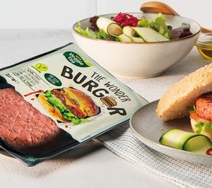 Según comunica Aldi, la nueva 'Wonder Burger' ya está disponible en los 309 establecimientos de la cadena. Su posicionamiento nutricional se configura con un aporte calórico de 178 kcal por 100 gr, y de 9 gr de grasas saturadas, para un aporte de proteínas de 17 gr por unidad, frente a los 20,3 gr por unidad de la hamburguesa de Lidl. Todo ello en función de una etiqueta protagonizada por concentrado de proteína texturizada de soja, aceite de coco, aromas, almidón de maíz, matilcelulosa, dextrosa, cascara de psyllium, inulina y extracto de remolacha.