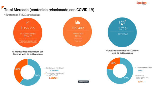 El coronavirus ha puesto en jaque las estrategias en redes sociales de la mayor parte de empresas españolas. Ante un acontecimiento de tal magnitud, los planteamientos estratégicos de los departamentos de social media han debido cambiar rápidamente y, en este contexto, el sector del gran consumo, uno de los que más apuesta por los contenidos de alto valor añadido para el usuario, ha apostado claramente por modificar sus estrategias y relacionarse con sus seguidores teniendo en cuenta el contexto actual. Epsilon Technologies ha analizado estas nuevas estrategias en redes sociales en el Gran Consumo, teniendo en cuenta las interacciones relacionadas con el COVID-19 correspondiente al mes de marzo 2020. Según el panel de empresas de gran consumo en redes sociales (9 marzo-5 abril 2020), el 40% de las interacciones generadas en el gran consumo en redes sociales han estado relacionadas con la pandemia y concluye que el contenido relacionado con el COVID-19 es actualmente un 75% más eficiente que otras estrategias de contenidos.