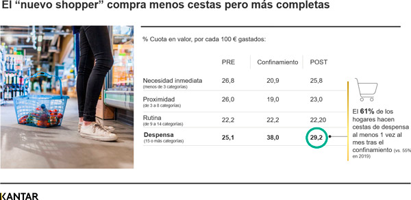 La llegada del desconfinamiento ha modificado cómo y qué compran los hogares lo que, a su vez, ha supuesto que fabricantes y distribuidores se vean en la necesidad de revisar su plan comercial para adaptarse a estos nuevos hábitos, según ha constatado Kantar, consultora especialista en paneles de consumo. Según esta misma fuente, uno de los cambios más notorios lo ha originado la frecuencia de compra, que ha hecho perder 38 M de cestas desde el confinamiento -un 4% menos que en el mismo periodo del año anterior- aunque, en contraposición, los españoles hemos llenado más las cestas en cada acto de compra que realizamos. Los mayores incrementos se han dado en las de despensa (que representan el 29,2% del total), dado que el 61% de los hogares ha hecho compras de este tipo al menos una vez al mes tras el confinamiento, lo que supone un 6% más que en 2019. Asimismo, la situación actual también ha provocado que modifiquemos los productos y referencias que adquirimos.