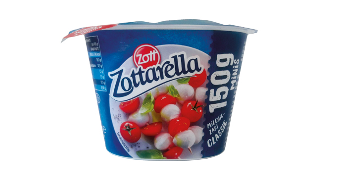Ideal como aperitivo: el mini queso mozzarella cremoso y tierno estilo clásico Zott Zottarella (1) es un queso mozzarella lanzado recientemente en un nuevo formato, que incluye una sugerencia de presentación novedosa (Alemania).