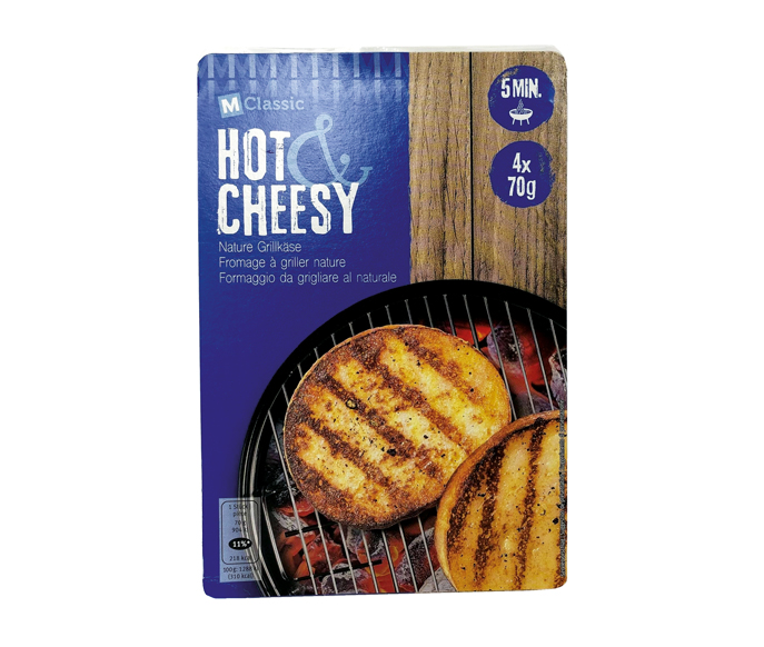M Classic Hot & Cheesy Grill Cheese (2) se presenta como un delicioso producto elaborado con queso Gouda para cocinar a la plancha, muy rápido y fácil de preparar, que adquiere una textura tostada y crujiente. Su tiempo de cocinado es de cinco minutos (Suiza).
