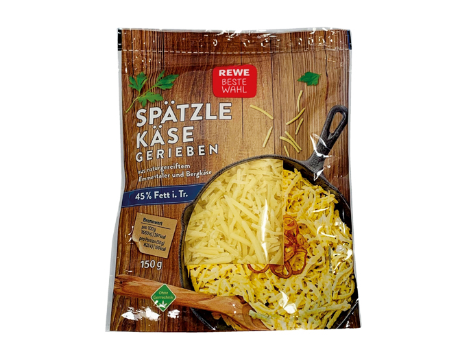 Queso rallado suabo para pasta Rewe Beste Wahl (3). No solo es un queso rallado, sino que está pensado especialmente para preparar pizzas. Curado de forma natural, este queso está elaborado con un 48,5% de queso emmental y un 48,5% de queso de montaña (Alemania).