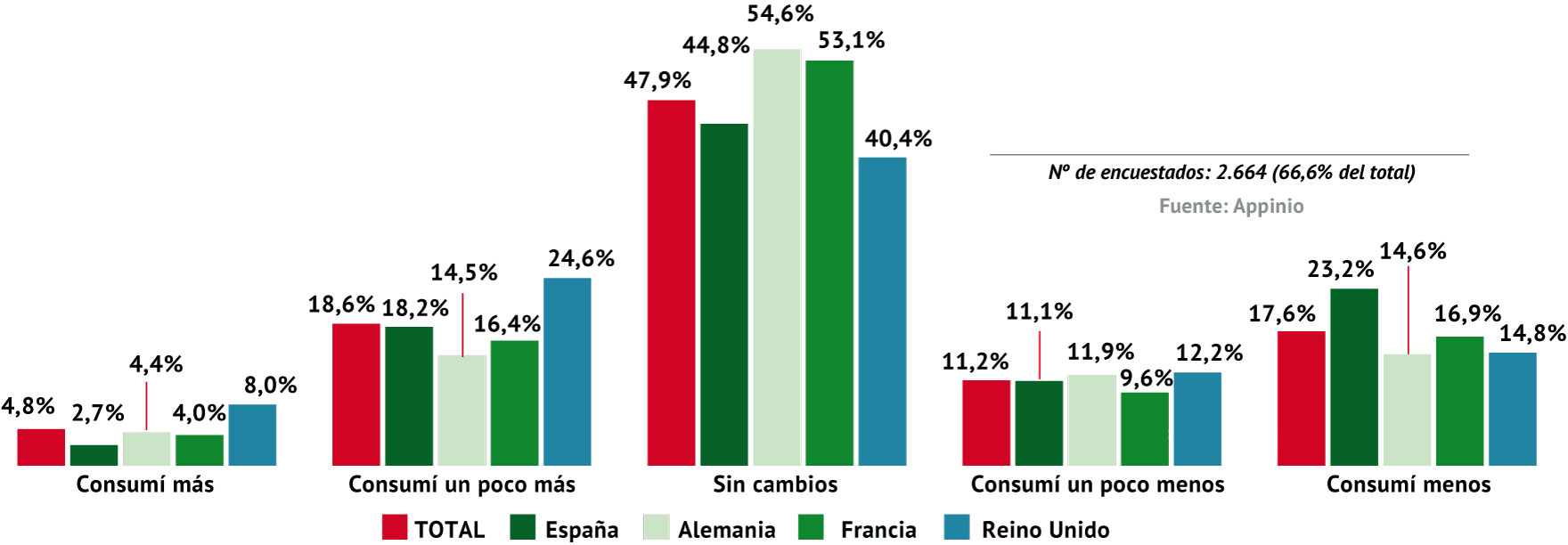 Durante el periodo de confinamiento general y los meses posteriores, marcados estos por las restricciones impuestas por la crisis pandémica, cuatro de cada diez españoles mantuvo intacto su consumo de alcohol. En concreto, un 44,8% de los consultados manifiesta la ausencia de variaciones en su consumo; mientras un 23,2% declara haber consumido menos bebidas alcohólicas en el periodo y un 18,2% haber consumido “un poco más”. Si ampliamos el foco al ámbito europeo, el estudio desvela que, a nivel global, un 47,9% de los usuarios consultados no habrían experimentado cambios en su consumo de este tipo de bebidas (porcentaje que se eleva hasta el 53,1% en el caso de Francia y al 54,6% si atendemos a las respuestas de los encuestados alemanes) y un 28,8% habría consumido menos (el 17,6% menos y el 11,2% un poco menos).