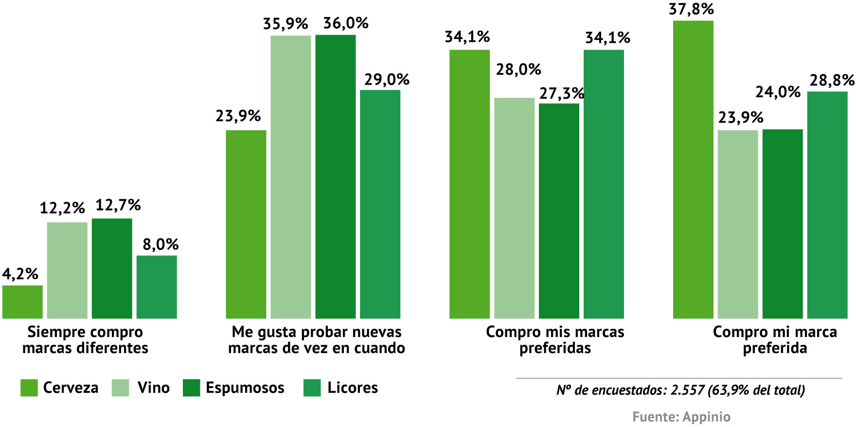Si atendemos a las preferencias en vino, los españoles admiten una mayor fidelidad a su marca o marcas preferida, con un 34,9% de encuestados que se decantan siempre por las mismas enseñas y un 23,8% que se inclina siempre por la misma marca, frente al 28% y el 23,9% de los europeos que se mueven en esas respuestas, respectivamente. Entretanto, los europeos se muestran de media más proclives a probar nuevas marcas de vez en cuando (35,9%), frente al 30,2% de los españoles que se inclinan por marcas diferentes, y también es mayor el porcentaje (12,2%) de aquellos que adquieren nuevas referencias cada vez que compran en comparación con el usuario español (11,1%).
