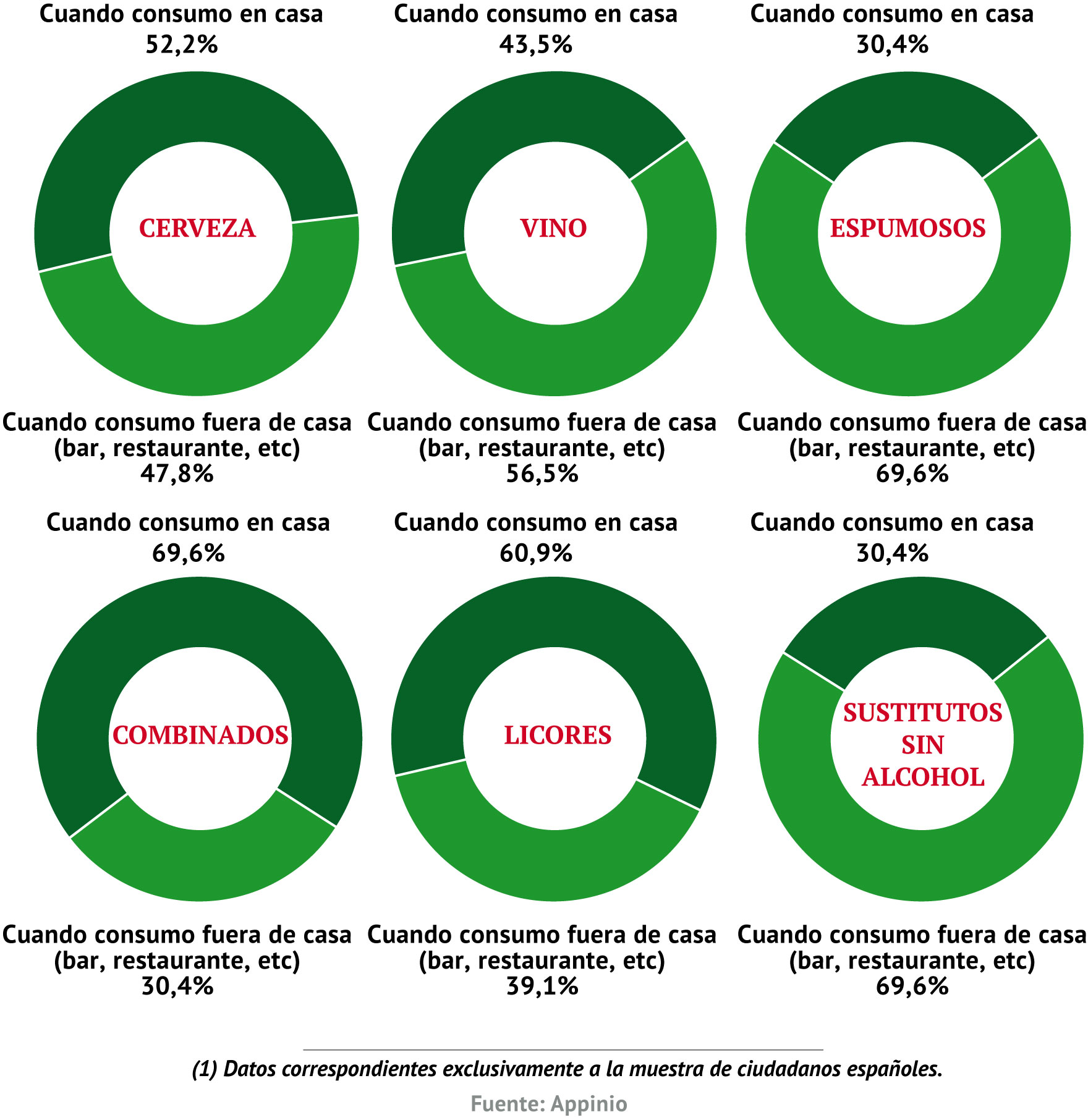 En nuestro país, el consumo de cervezas estaría equilibrado en los ámbitos doméstico y extradoméstico, con el 47,8% y el 52,2% de las respuestas de los encuestados; y también se balancearía entre ambos canales el consumo de vinos, toda vez un 56,5% de los encuestados en suelo español revelan consumir en casa y el 43,5% fuera de sus hogares. En el caso de licores, la tendencia en España es justo la contraria que, en el conjunto de los países seleccionados para la muestra, con una inclinación mayoritaria del consumidor al ámbito extradoméstico (un 60,9% de los preguntados).