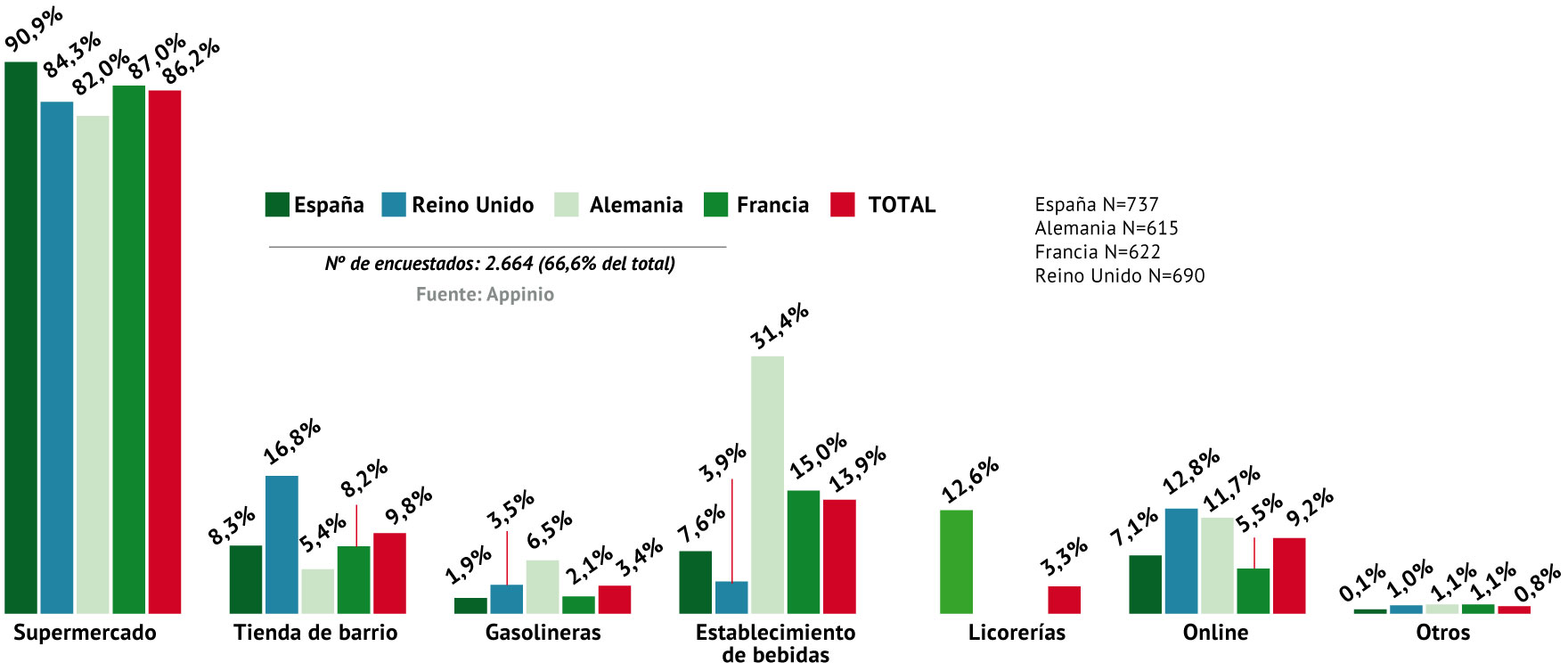 Los resultados del estudio elaborado por Appinio desvelan una aplastante victoria de los supermercados como canal de adquisición mayoritario de alcohol en Europa, con un porcentaje que alcanza el 86,2% y que se eleva hasta el 90,9% en suelo español. Un 8,3% de los consumidores patrios manifiesta que adquiere bebidas alcohólicas en tiendas de barrio y un 7,6% en establecimientos de bebidas especializados. En lo que respecta al canal protagonista de la pandemia, el e-commerce o canal online, España camina por detrás de la corriente europea, donde un 9,2% de los consumidores declara comprar alcohol online frente al 7,1% de los compradores españoles que hacen uso de internet para adquirir este tipo de productos. Por países, Reino Unido y Alemania concentran un 12,8% y un 11,7%, respectivamente, de consumidores que adquieren alcohol a través de internet, frente al 5,5% de ciudadanos franceses que hacen lo propio.