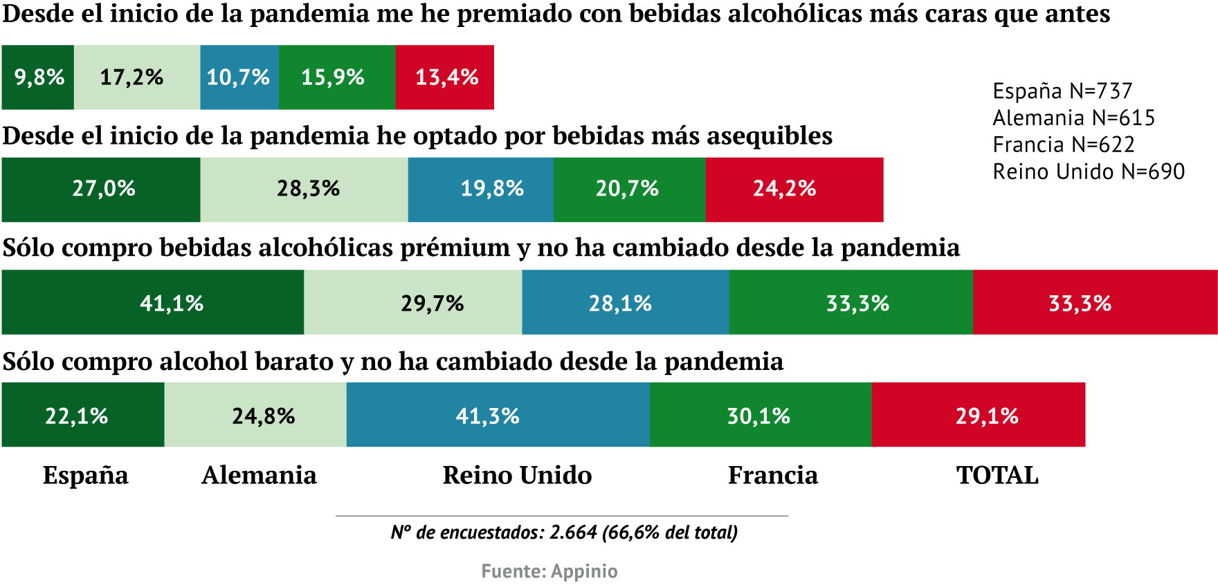 En el otro extremo, un 27% de españoles y un 28,3% de británicos se habrían decantado por bebidas más asequibles desde el inicio de la pandemia, frente a alemanes y franceses, en cuyo caso el porcentaje de usuarios que se inclinaron hacia productos más baratos rondó el 20%. Al tiempo, los españoles se desvelan como los menos proclives a consumir alcohol barato y, así, sólo un 22,1% responde que habría mantenido sin cambios su consumo de bebidas alcohólicas en el rango más asequible. Frente a este porcentaje, el informe de Appinio arroja porcentajes del 41,3% en el caso de los alemanes y del 30,1% en el colectivo francés, que se declaran consumidores de referencias de menor valor añadido y cuya preferencia no habría variado en este tiempo.