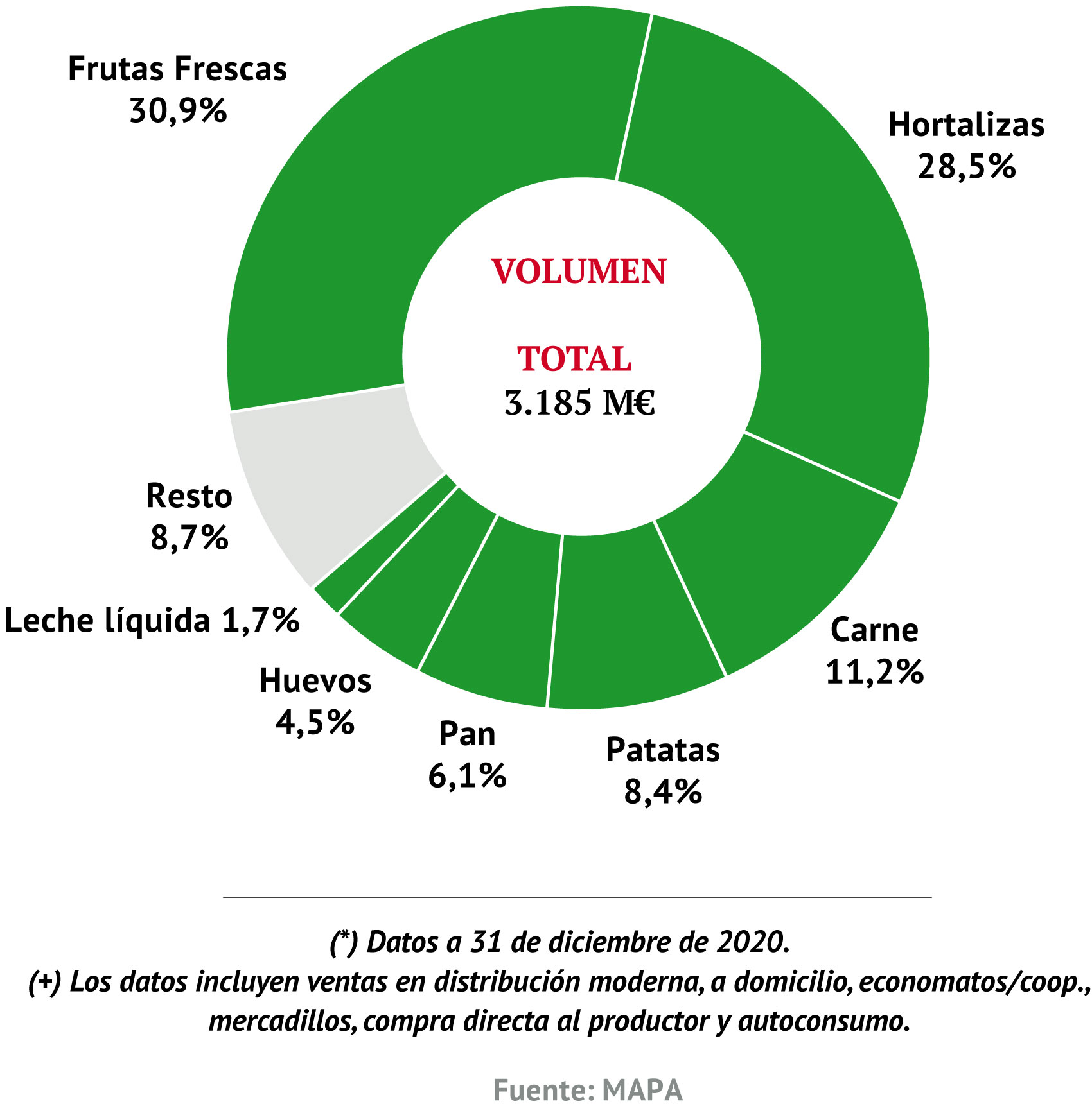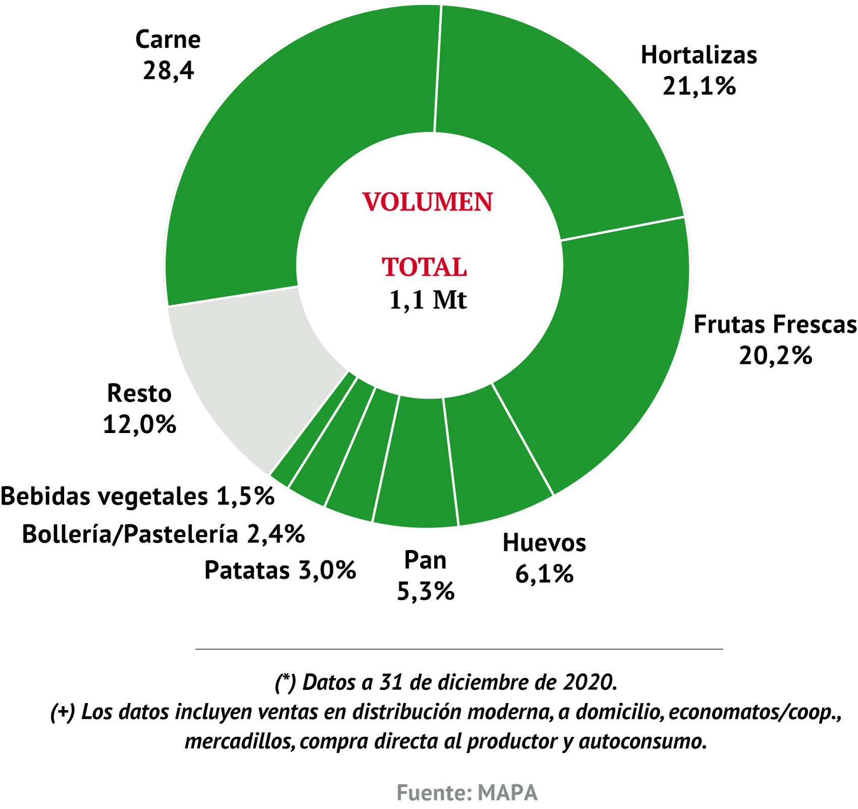 Teniendo en cuenta estas salvedades, el MAPA establece que, en 2020, la compra de ecológicos en España ascendió a 1,1 Mt/l y 3.185 M€, situándose el precio medio en 2,81 €/kg/l, el gasto per cápita en 68,91 €/kg/l y, la ingesta promedio, en 24,50 kg/l. Las frutas frescas son el producto con un mayor consumo per cápita (7,56 kg/persona), junto con las hortalizas (6,99 kg/persona) y la carne (2,74 kg/persona). Como consecuencia, las frutas se quedan con el 30,9% del mercado en términos de volumen; las hortalizas, con el 28,5%; y, la carne, con el 20,2%. Por contra, en valor es esta última categoría la que encabeza el ranking, con una participación del 28,4%, seguida de las hortalizas (21,1%) y las frutas (20,2%).