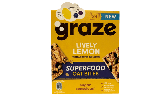 Algunos productos identifican claramente los “marcadores de salud” que pueden facilitar el equilibrio entre los momentos de picoteo y las comidas. En los Países Bajos, Graze Lively Lemon Superfood Oat Bites (2) ofrece aperitivos en porciones individuales. El envase también sugiere la parte del día óptima para comer el tentempié: “dale un empujón a tu tarde”.