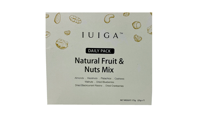 En Singapur, Iuiga Natural Fruit & Nuts Mix Daily Pack (3) destaca que una porción diaria proporciona una mezcla equilibrada de frutas y frutos secos de primera calidad.