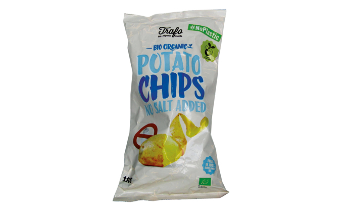 Las marcas deben explicitar las características de sus envases ecológicos para hacerlas visibles a los consumidores, especialmente a los grupos de edad más jóvenes. En Alemania, las patatas fritas ecológicas Trafo (8) están disponibles en un envase sin plástico y compostable que lleva los logotipos de hoja verde y semilla compostable de la UE. En este caso, Trafo muestra muy claramente en el envase que está libre de plástico, facilitando que el consumidor lo entienda y reconozca fácilmente.