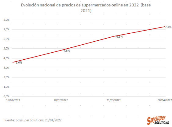 Los precios de los 195.000 productos analizados en nueve de los grandes supermercados online españoles han subido de media un 7,3% en el primer cuatrimestre de 2022, cuando en 2021 cerró con una subida de 1,1%, según el último estudio de Soysuper Insights. En enero, el incremento fue del 3,6%, en febrero del 4,8%, en marzo del 6,3%, para finalizar abril con el 7,3% de subida.