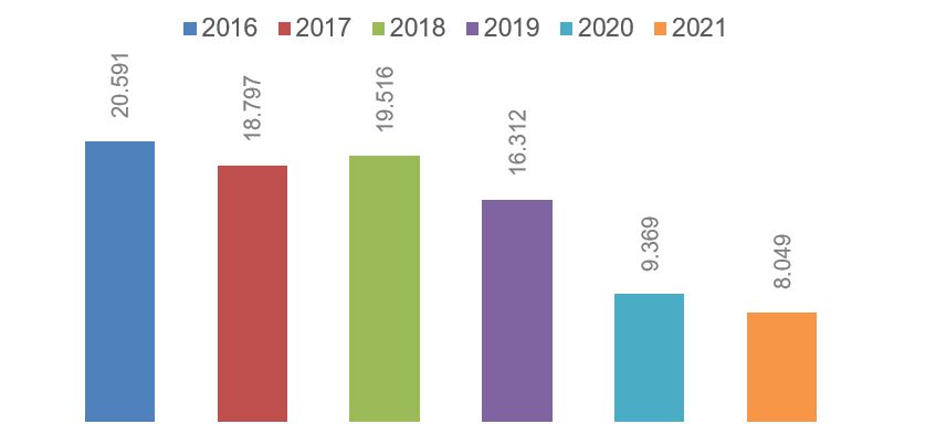 Nuestro país importó a lo largo de 2021 un total de 285.760 t de semillas de girasol, valoradas en más de 222 M$. El volumen de importación durante este año es un 60% más alto que en 2017, cuando su importación total fue de 112.841 t. Este porcentaje de crecimiento es un 20 % más bajo que el experimentado desde 2016 a 2020 (80 %), lo que indica que la tendencia ascendente experimentada en los últimos cinco años ha decrecido levemente.