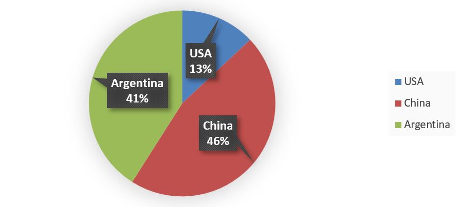Fuera del ámbito comunitario, los principales competidores de Estados Unidos son China y Argentina, conformando así un 22 % del volumen total de importaciones. Respecto a este año, durante los meses de enero a marzo, España ha importado un total de 96.740 t, lo que supone un 59,4 % más que lo importado en el 2021 durante esos meses (60.690 t).