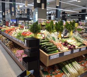 “Con fruta y verdura la salud siempre perdura”. Este es uno de los múltiples mensajes que adornan el universo hortofrutícola del supermercado ‘BM Complet’ que Uvesco gestiona en el municipio madrileño de Majadahonda (1.356 m²). Establecimiento que, a su vez, forma parte del nuevo concepto de tienda que la empresa está implantando desde 2018, uno de cuyos objetivos es dotar de mayor protagonismo a los frescos. Entre ellos, destaca la sección de frutas y hortalizas gracias a su ubicación, a la entrada del local, y, sobre todo, a su estilo -minimalista en tonos negros- para dar sensación de elegancia y sobriedad. De hecho, tanto los mensajes repartidos por las paredes, como el nombre de la sección, son fotografías en blanco y negro que se presentan en “marcos gráficos con visuales impresos en textil sobre los que se colocaron metacrilatos iluminados con led”, para “llamar la atención de todas las miradas”
