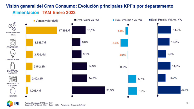 Pese a que la inflación se moderó en los últimos meses del año y el IPC se situó en enero en un 5,9%, los españoles nos hemos gastado un 9,9% más en la cesta de la compra de enero de 2023 respecto al mismo mes del año anterior, comprando un 4,1% menos de productos, lo que supondría una subida real del precio medio-volumen del 14%, según los datos aportados por el último Barómetro de IRI. De ese modo, el gasto en productos de gran consumo en retail alcanzó un valor de 6.318,6 M€, correspondiendo un 39,6% a productos de alimentación, un 29,23% a frescos, el 14,4% a bebidas, un 10% a perfumería e higiene y el 6,7% restante a droguería y limpieza.