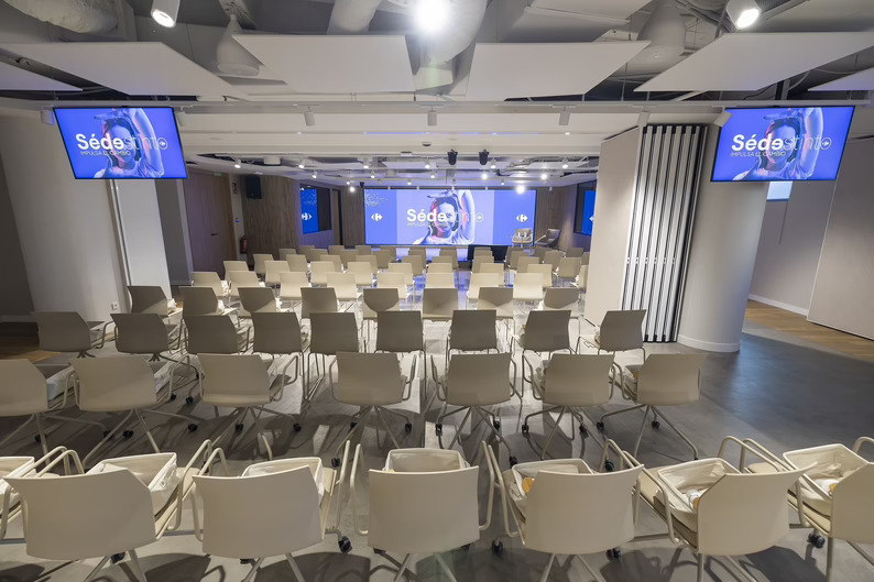 La oficina central de Carrefour se organiza en torno a conceptos "open spaces" y zonas de colaboración informal con múltiples áreas de trabajo. La compañía impulsa este cambio para adaptarse a un entorno más competitivo y digital, fomentando una organización más sencilla y haciendo partícipes a todas las personas que forman parte de la compañía para impulsar la evolución, la adaptación, y con ello, el crecimiento. La nueva sede del Grupo Carrefour en España nace con vocación aperturista y con el compromiso de ser un gran punto de encuentro para sus socios y proveedores especialmente los locales, claves en su modelo de negocio. Por ello, todas las salas de reuniones de la Sede Omega cuentan con la última tecnología en audiovisuales, adecuada al tamaño de cada una de las salas y en su auditorio, con capacidad de hasta 200 personas, se ofrece un sistema de traducción simultánea y para las personas con dificultades de audición, se ha dispuesto un bucle magnético para mejorar la calidad acústica del espacio. Este sistema, permite que el sonido que se emite en los micrófonos de la sala llegue con la misma calidad a los audífonos porque se evita todo tipo de interferencias como la reverberación natural de la sala, el ruido ambiente o la distancia del emisor de sonido. Además, se ha dotado de equipamiento audiovisual en las zonas comunes como el hall, la cafetería o la gastroteca, para facilitar la comunicación interna con los empleados.