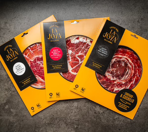 La marca de jamón ibérico 'La Joya', elaborada por Industrias Reunidas Jabugo (grupo Vall Companys), ha lanzado sus primeros loncheados, formato con el que se adapta a las nuevas exigencias del canal tradicional especialista, Horeca y mercados internacionales, canales donde concentra sus ventas. Así, además de servir jamones y paletas ibéricas en piezas, 'La Joya', también estará presente en platos redondos con jamón ibérico loncheado a mano y envasado al vacío en porciones de 90 gramos.
