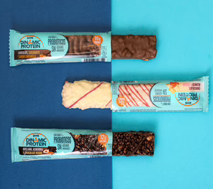 Esta nueva gama de productos cuenta con tres referencias, todas ellas sin gluten: barrita de chocolate con leche, cacahuete y sabor caramelo; barrita de chocolate negro, avellana y almendra, y barrita de chocolate blanco con fresa y almendra. Estas nuevas referencias de 'Dinamic Protein' tienen entre 12-16 gramos de proteína extra por barrita, e incluyen probióticos, microorganismos que ejercen una acción beneficiosa en el organismo ayudando a nuestra microbiota.
