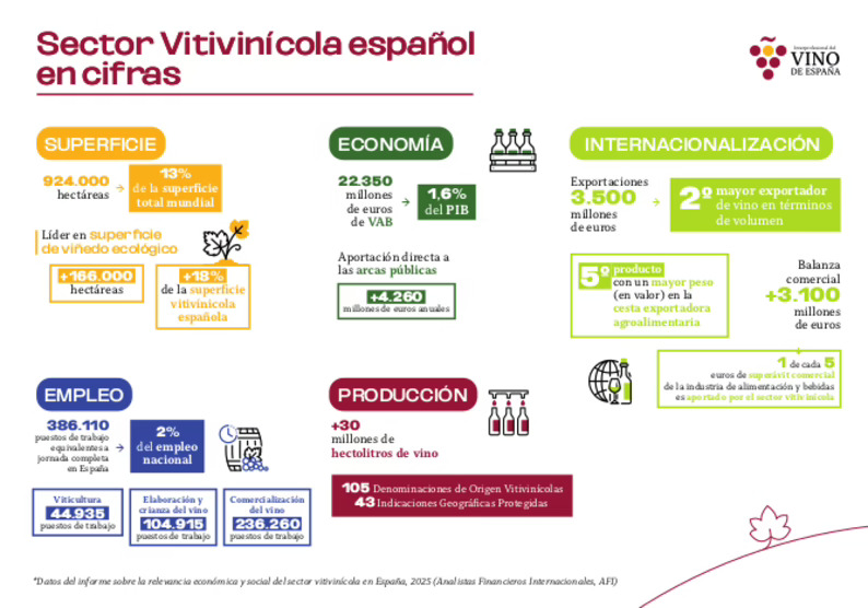 El Informe elaborado por Afi a petición de la Interprofesional del Vino presenta a España como país líder en hectáreas de viñedo (el 13% del mundo, unas 921.000 ha en el último registro) y también en viñedo ecológico (166.000 ha); con 532.000 viticultores registrados, lo que da idea de la fuerte atomización y diversificación geográfica que enfrenta. Se posiciona como tercer productor mundial de vino, con algo más de 30 M hl en 2024, y más de 3.500 M€ generados por exportaciones ese mismo año. De hecho, España vende más vino del que consume y mantiene una balanza comercial positiva, de más de 3.100 M€.