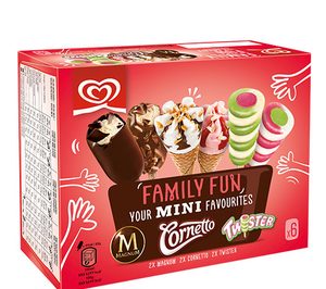 La marca de bandera del grupo Unilever para helados ha presentado las novedades de cara a la temporada 2015, que ya adelantó Alimarket la semana pasada . No obstante, además de estos lanzamientos, hay aspectos de la nueva política comercial interesantes y que pueden crear tendencia de cara a próximos veranos . El más interesante, es la creación de multipacks para el consumo en el hogar que incluyen varias referencias distintas de helados en cada caja, a los que 'Frigo' ha denominado "Mix packs" . Inicialmente introduce dos modalidades: el "Evening Selection" , que contiene tres 'Cornetto' de los sabores más populares (Clásico, Chocolate y Fresa) y tres 'Magnum' (Clásico, Blanco y Almendras); y el 'Family Fun' , especialmente pensado para compartir con toda la familia, con dos 'Magnum Mini' (Clásico y Almendras), dos 'Cornetto Mini' (Clásico y Fresa) y dos 'Twister Mini'. Al margen de esta nueva e interesante propuesta, para 'Cornetto' lanza dos nuevas referencias: multipack de 'Cornetto Mini' sabor chocolate y el nuevo 'Cornetto Cookies’n’Dream' (sabor galleta, con salsa de chocolate y crujientes trocitos de chocolate negro y galleta), en este caso en tamaño clásico y pack con cuatro unidades. En cuanto al catálogo para el púbico general, las novedades se complentan con los ya adelantados por Alimarket 'Magnum Pink Frambuesa' y 'Magnum Black Espresso'.