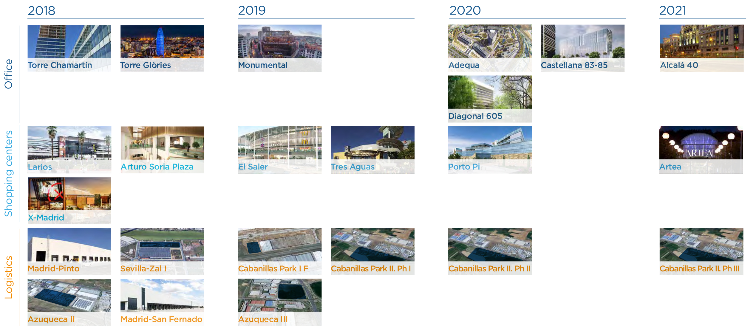 Entre sus principales proyectos pendientes de ejecución en el sector de oficinas, figuran la reforma de la Torre Chamartín en Madrid, con un desembolso de 3,9 M€ y el de la Torre Glòries de Barcelona, con 15 M€, y que estarán completadas el próximo año. Ya en 2019, Merlin tiene previsto culminar la rehabilitación del complejo Monumental de Lisboa, con un desembolso de 20 M€, y un año después finalizará el complejo Adequa en la capital, que absorberá una inversión superior a los 57 M€ repartida en varias fases, así como el complejo de oficinas Castellana 83-85, que se llevará más de 20 M€ de inversión. El edificio Diagonal 605 en Barcelona y el de la calle Alcalá 40 de Madrid serán otros proyectos que ejecutará en 2020 y 2021 respectivamente.