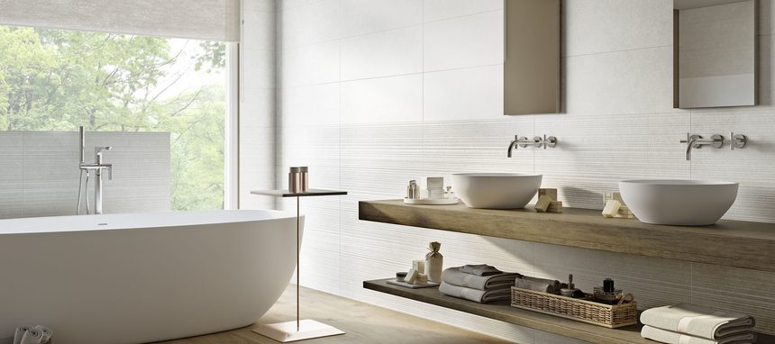 Las novedades en revestimientos para este año se centran en primer lugar en cerámicas de pasta blanca, un material muy demandado, pero también en la aparición de series como Roche y Concret, que con su gran formato (50x100), sucumben a las últimas tendencias. No se quedan atrás los formatos de 30x90 rectificados que añaden siete nuevas series. En cuanto a tonalidades, el metalizado más suave hace acto de presencia en series como Eisen.