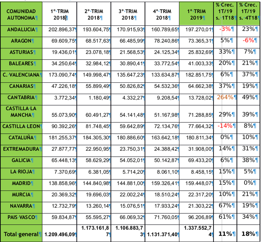 Por regiones, el crecimiento es generalizado en todas las comunidades autónomas, a excepción, en la comparativa del primer trimestre de 2019, con el primer trimestre del año anterior, en Andalucía y en Castilla y León, así como en la comparativa con el cuarto trimestre del año anterior en Aragón. El mayor incremento se sitúa en Cantabria, con un 264% más con respecto al primer trimestre de 2018. Le siguen Navarra y el País Vaco.