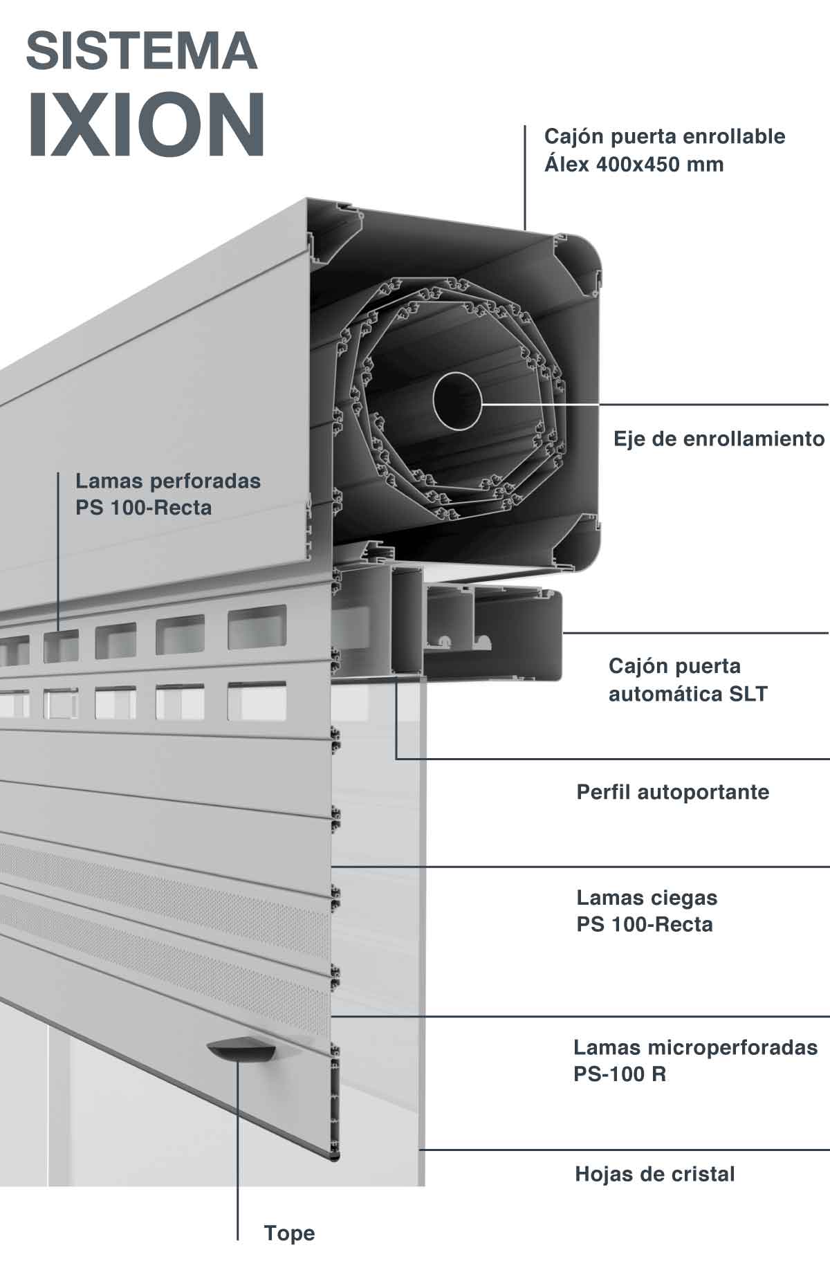 Giménez Ganga presenta 'Ixion', un sistema de acceso y seguridad que integra en un solo producto dos puertas; una enrollable y una automática de cristal. Así, 'Ixion' combina las ventajas de una puerta automática de cristal, que puede ser tanto corredera como telescópica, con las de un cierre enrollable. De este modo, los modelos 'SL5' y 'SLT' se integran a la perfección con una lama de persiana de aluminio extrusionado PS-100 R, que queda alojada en el cajón 'Álex' 400×450 mm.