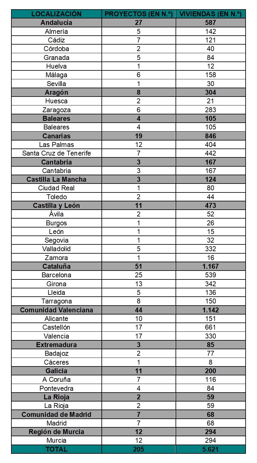 El contrato adjudicado a Domo contempla, además de la finalización de los proyectos residenciales, la comercialización de las viviendas en el mercado de particulares. Por comunidades autónomas, la mayoría de las viviendas se concentra en Cataluña (1.167), Comunidad Valenciana (1.142), Canarias (846), Andalucía (587) y Castilla y León (473).