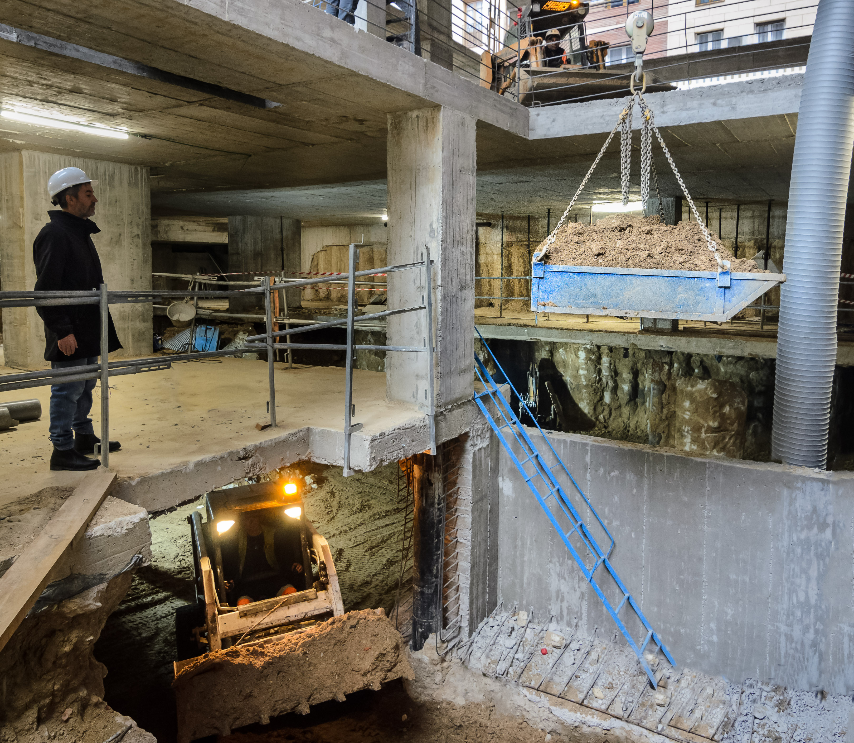 Después de esa primera fase, y tras completar la primera losa sobre el nivel del terreno existente, bajo rasante, se excava hasta la cota inferior de la siguiente losa para poder ejecutar la misma (colocación de armados y hormigonado) sobre el terreno; se completa el nivel con la ejecución del tramo de pilares entre dicha losa y la anterior (planta baja y sótano-1).