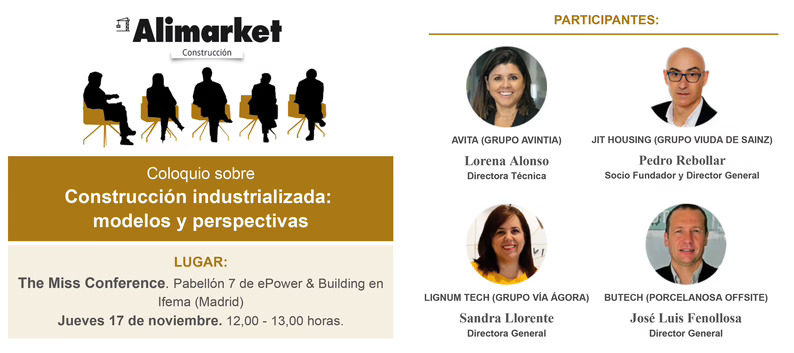En el coloquio intervendrán José Luis Fenolloso, director general de Butech (Porcelanosa Offsite), Lorena Alonso, directora técnica de Ávita (grupo constructor Avintia), Pedro Rebollar, socio fundador y director general de Jit Housing (del grupo constructor Viuda de Sainz), y Sandra Llorente, directora general de Lignum Tech (empresa del grupo promotor Vía Agora). El debate, moderado por José Luis Varea, director de Alimarket Construcción, estará precedido e ilustrado por una breve presentación de 5 minutos de cada sistema. Para asistir al evento y a la propia feria, pueden utilizar el código de descuento CO220106583YK registrándose mediante el siguiente enlace.