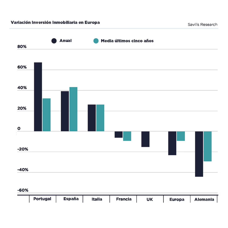 La región del sur de Europa (España, Italia y Portugal) registró en 2022 su mayor participación sobre el volumen total de inversión inmobiliaria en el continente, con un 11% frente al 6 % en 2021 y por encima de una media del 7% en los últimos cinco años. En España, el volumen de inversión en el sector inmobiliario alcanzó los 16.600 M€ en 2022, registrando un aumento del 39% con respecto al año anterior y acaparando un 52% del total invertido en la región. Portugal fue el país con mayor incremento, al registrar un 67% más con 3.300 M€. Italia por su parte registró 11.600 millones de euros, un 26% más.